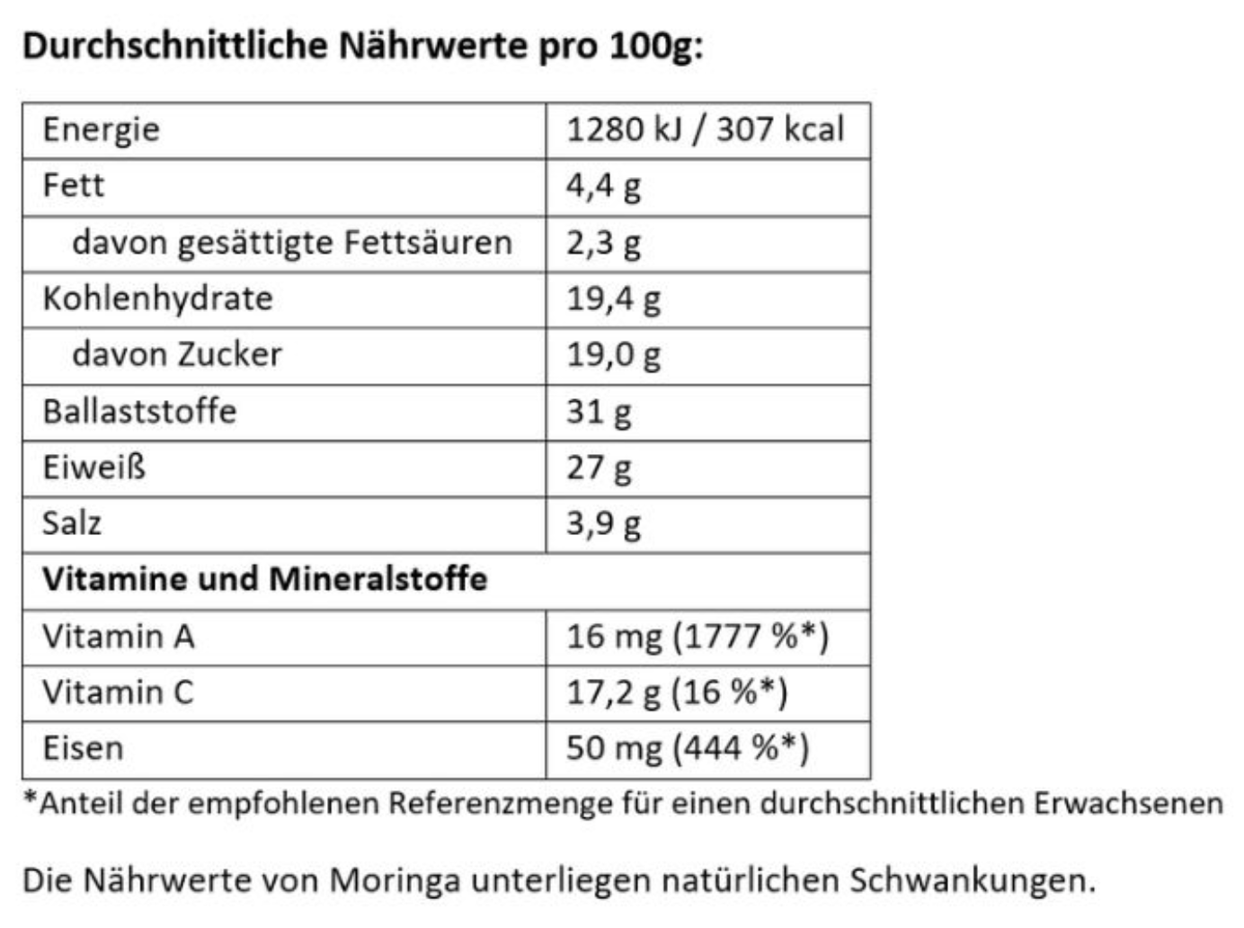 Zutaten: 100 % Moringablattpulver gemahlen - aus kontrolliert biologischem Anbau