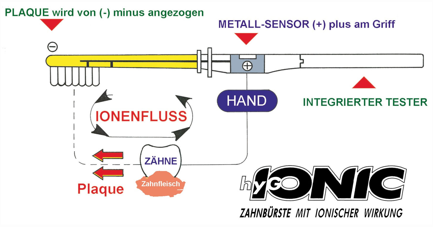 Beim Putzen mit der hyG Zahnbürste verändert ein ständiger Fluss von positiven Ionen (+) von einer Lithiumquelle die Ladung Ihrer Zähne. Dadurch werden Ihre Zähne auch in jenen Bereichen, die mit der Bürste nicht erreicht werden können, von Zahnbelag freigehalten.