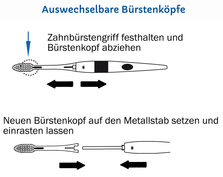 Sobald sich die Borsten nach aussen biegen oder nach ca. 3 Monaten, sollten Sie den Bürstenkopf erneuern. Dazu ziehen Sie den Bürstenkopf einfach mit einer kräftigen Bewegung vom Griff. Die neue Bürste wieder auf die Metallelektrode stecken und drücken, bis sie einrastet.
